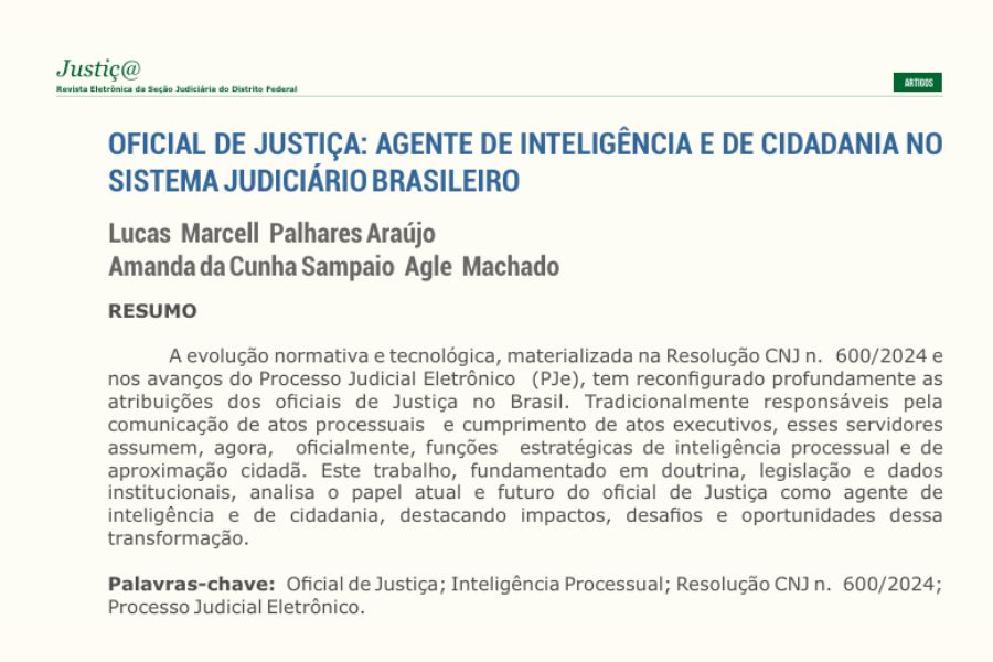 Entre os pontos centrais, o artigo destaca o reconhecimento normativo do Oficial de Justiça como Agente de Inteligência e de Cidadania e a importância da capacitação contínua em áreas como tecnologia, mediação e direitos humanos.